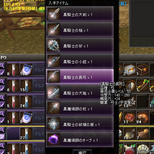 黒騎士装備はこんな感じでした。lvl.50から装備可能なのでまだまだ装備できません…。阿修羅箱とか光る系は敵からも落ちるようですがルーレット回すの楽しくなってきたw